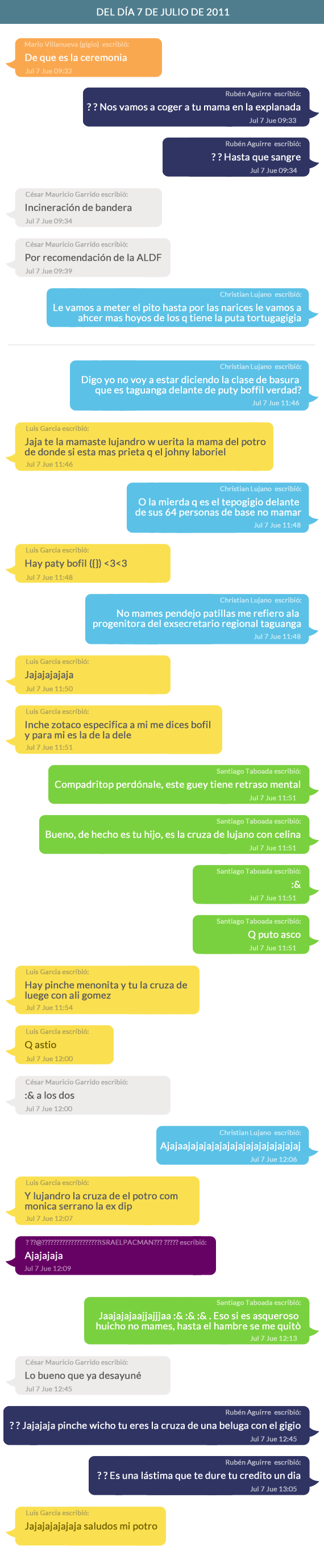 Por considerar su lenguaje ofensivo, parte de las conversaciones se han reservado. El uso de términos como “jotos”, “putos”, “putito”, “putas”, “oaxaco”, “indio”, “indiorante”, “menonita”, “chalán”, “teiboleras”, “perras”, “lesbiana” son comunes en los textos enviados por el grupo, de acuerdo con las copias entregadas por Delgado Becerril.