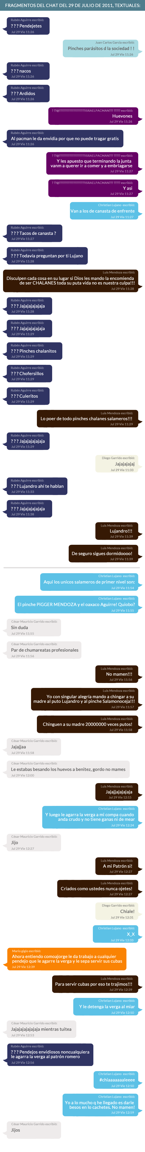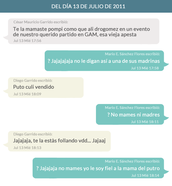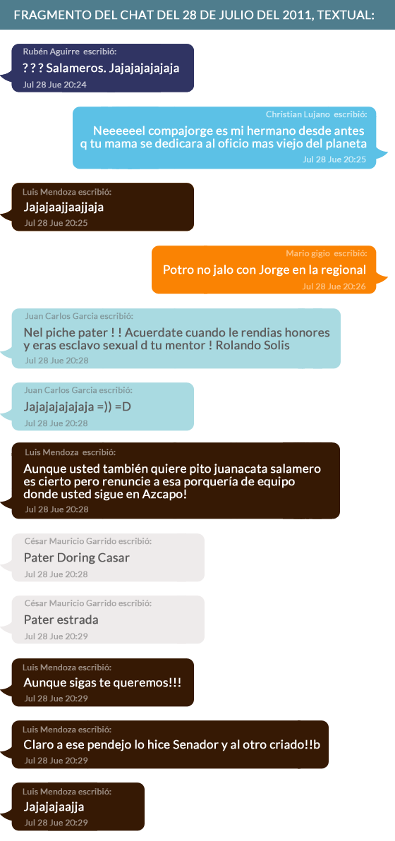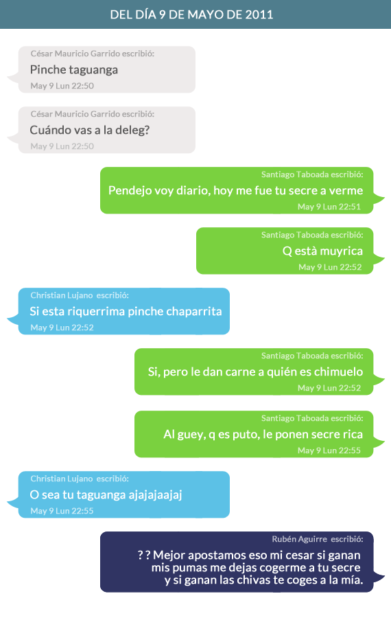 El Diputado Santiago Taboada dice, por ejemplo: “Si x favor Lujandro (Christian Lujano), supera que tu papá es puto y un pobre pendejo”. Luis Mendoza, el dirigente del PAN en el municipio: “Disculpen cada cosa en su lugar si Dios les mando la encomienda de ser CHALANES toda su puta vida no es nuestra culpa!!!”