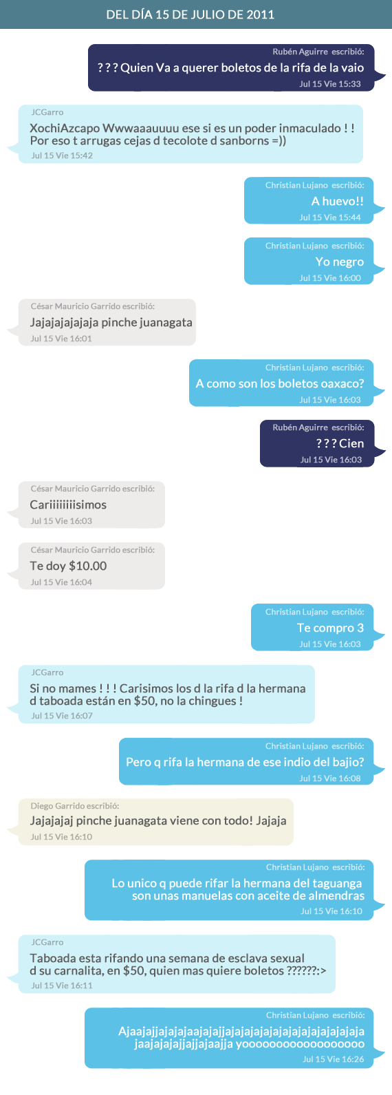El 7 de julio de 2011, los colaboradores de Jorge Romero Herrera conversan en el “Albur Buró”, en plena mañana laboral. Aparecen en sus blackberries los nombres de Santiago Taboada, Christian Lujano y César Garrido, actual Diputado local del PAN, así como el director general de Participación Ciudadana y el director Jurídico en la Delegación Benito Juárez, respectivamente. Denostan a compañeras panistas, como las ex diputadas Celina Saavedra Ortega y Mónica Serrano Peña. Hablan de hacer “sangrar” a una madre a través del acto sexual y se apuestan a sus secretarias.